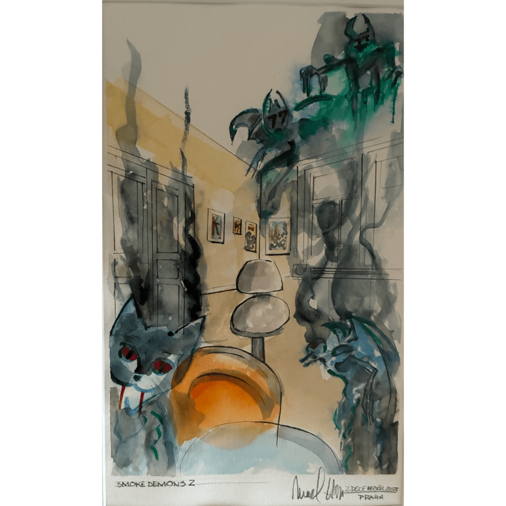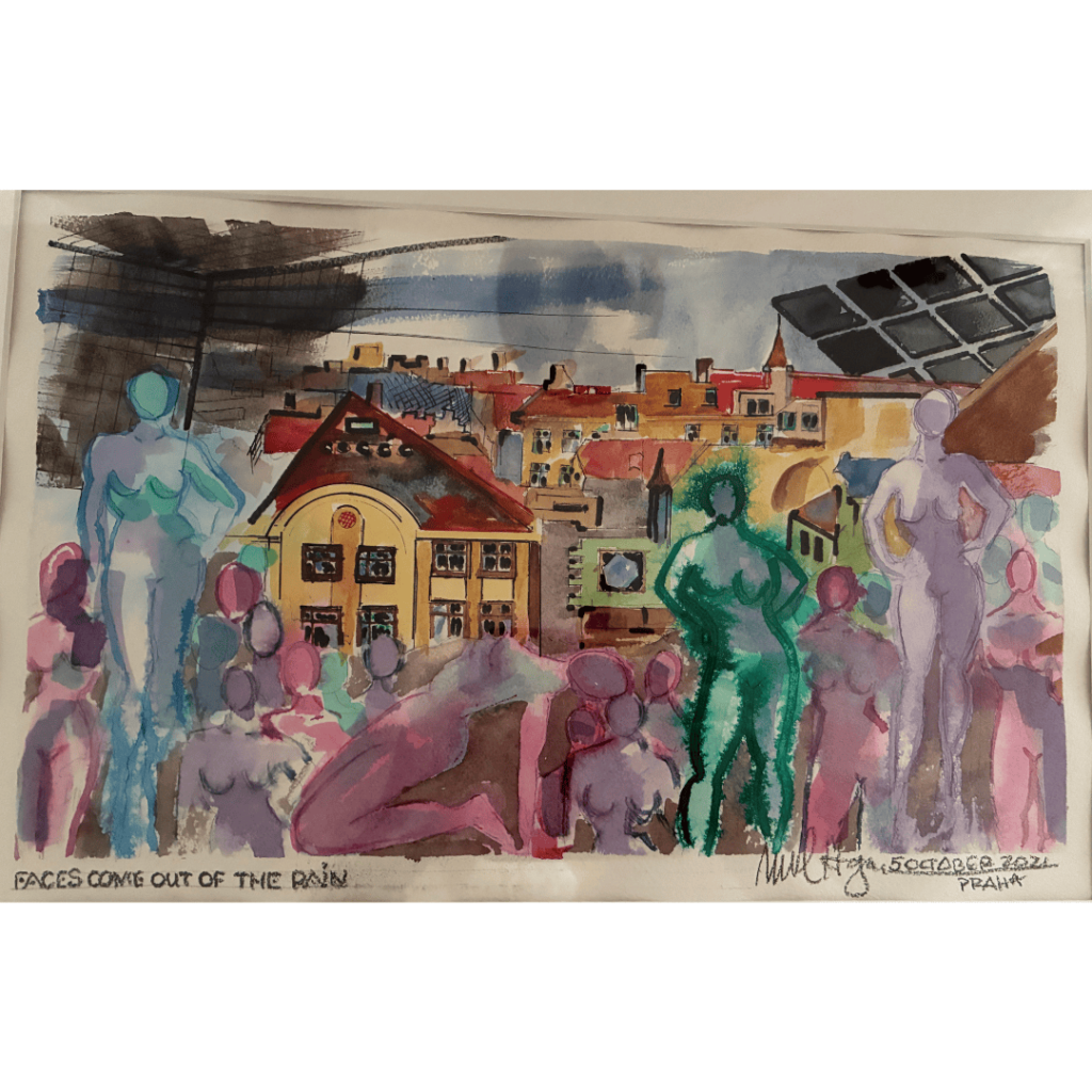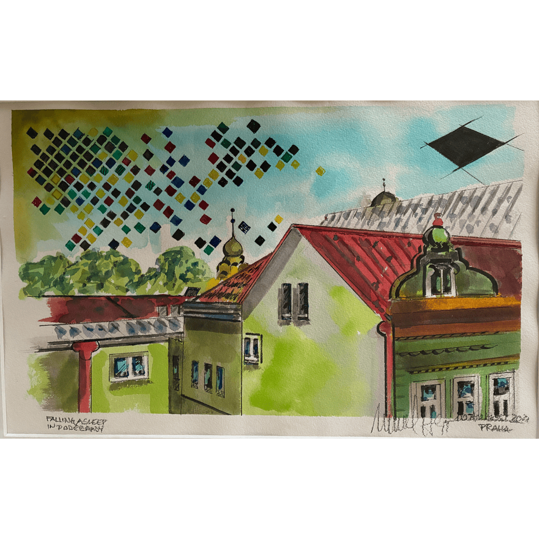 Tato série je pokračováním té cesty. Maluje akvarelem, temperou a kvašem — médiem krásným i neúprosným, které v kombinaci papíru, vody a pigmentu nabízí jedinečné možnosti. Pořád se učí, zkouší a nechává se překvapit tím, co se na papíře objeví.